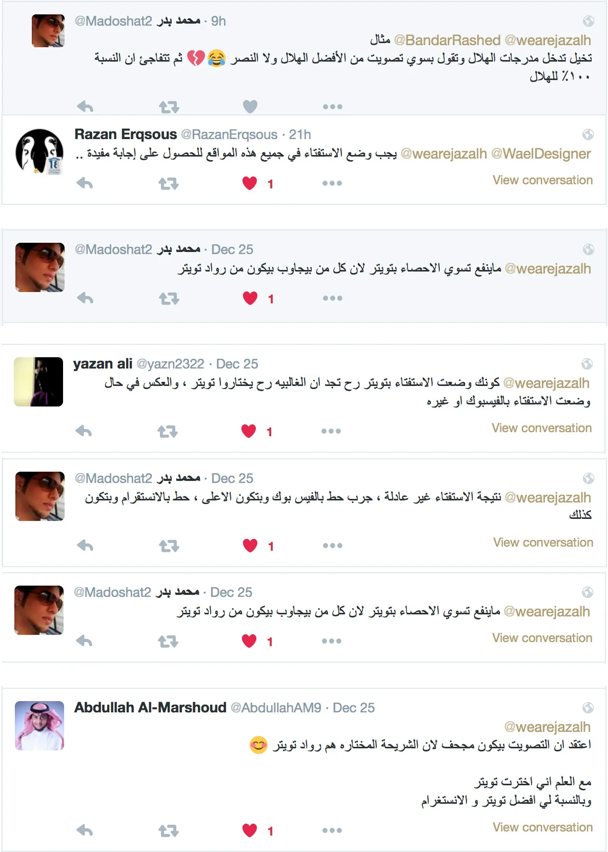 ٥- بالنسبة لنا في جزالة حقيقة التوصيت كانت لمعرفة ماهي المنصة الأكثر أهمية بعد تويتر لأننا نريد خدمة متابعنا على تلك المنصة والتي تبين أنها إنستقرام ، وقد أنشأنا الحساب فعلياً “ wearejazalh “ نلقاكم هناك :).